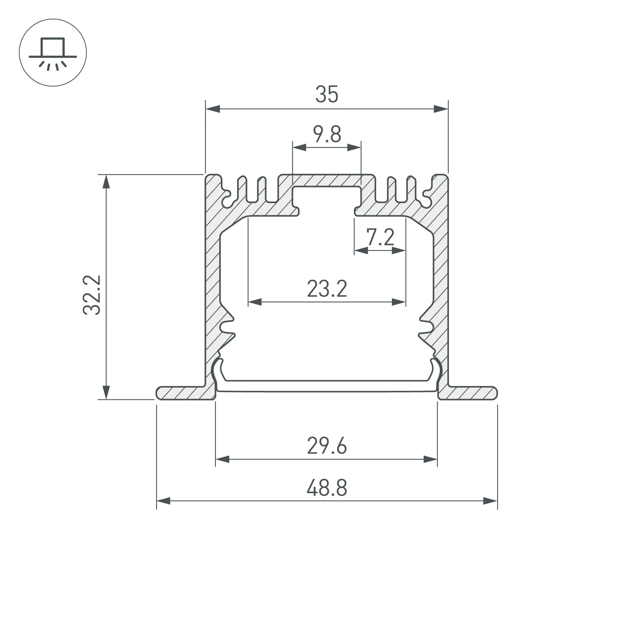 Комплект с экраном. Алюминиевый анодированный профиль для светодиодных лент и линеек. Габаритные размеры (L×W×H): 2500x49x32 мм, паз для установки 35 мм. Ширина площадки для ленты 23 мм. Аксессуары приобретаются отдельно. Цена за комплект: профиль - 2,5 м, экран - 2,5 м.