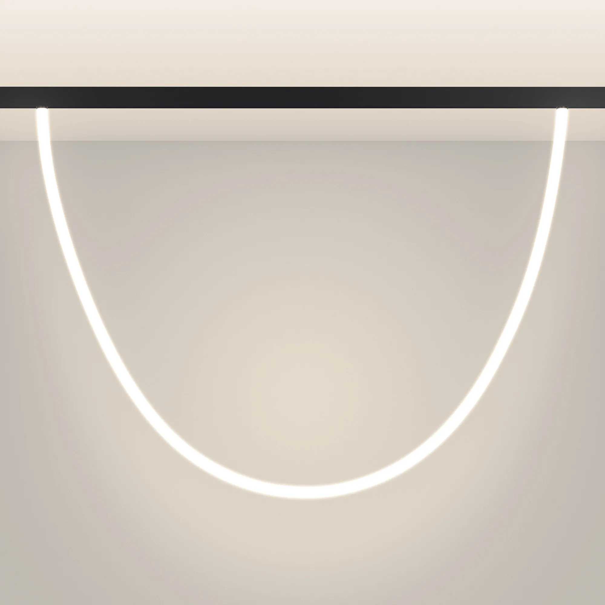 Светильник гибкий для магнитных треков серии ORIENT. Мощность 35 Вт, св. поток 2120 лм, 60 лм/Вт, теплый 3000 K, CRI>90, угол 360°, напряжение питания 48 В. Матовый белый фигурный корпус из силикона с черными креплениями. Размер: диаметр 25 мм, длина 2500 мм. Монтаж на магнитный трек ORIENT. Адаптеры в комплекте.