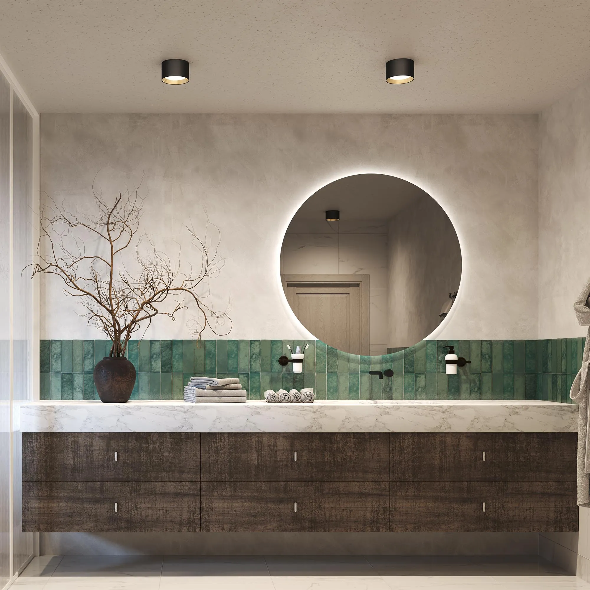 Накладной светильник. Мощность 15 Вт, св. поток 1100-1160 лм, 80-85 лм/Вт, теплый 2700 K, теплый 3300K, дневной 4000K (переключается), CRI>90, угол 80°, напряжение питания 230 В. Белый круглый корпус из алюминия с золотой вставкой, экран PC, степень защиты IP54. Размер: диаметр 140 мм, высота 85 мм. Монтаж накладной. Драйвер 26-42 В, 350 мА, пульсация <2%.