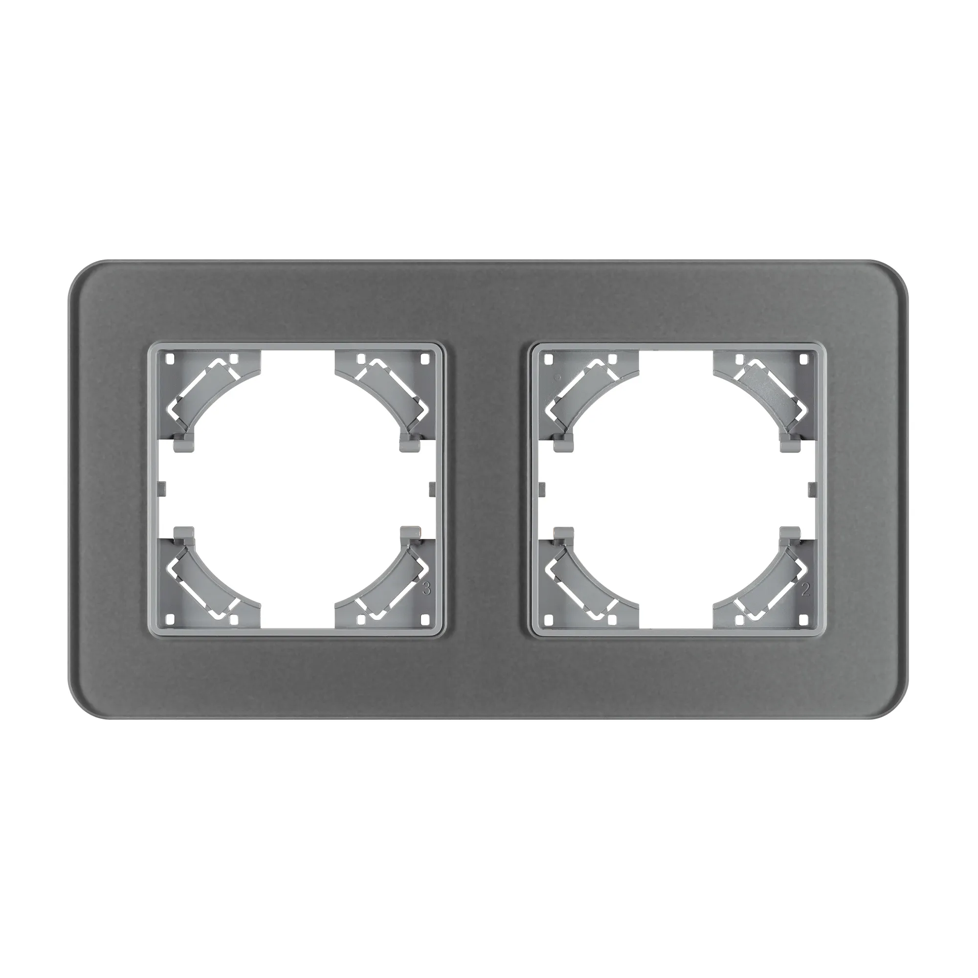 Рамка стеклянная на 2 поста, под встраиваемый механизм. Цвет - серый с Soft-Touch покрытием. Уровень герметичности IP20. Ориентация монтажа - горизонтальная (основным ориентиром служат посадочные выступы для накладки механизма).